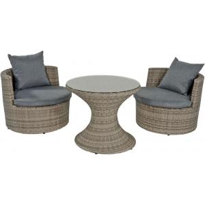 Balkon loungeset Ancona Cloud Specificaties: Afmetingen stoelen (DxH): 75 x 60 cm Afmetingen tafel (DxH): 71 x 60 cm Materiaal: 8 x 1.3 mm dubbel half rond wicker Materiaal tafelblad: Glas Kleur: Grijs…
